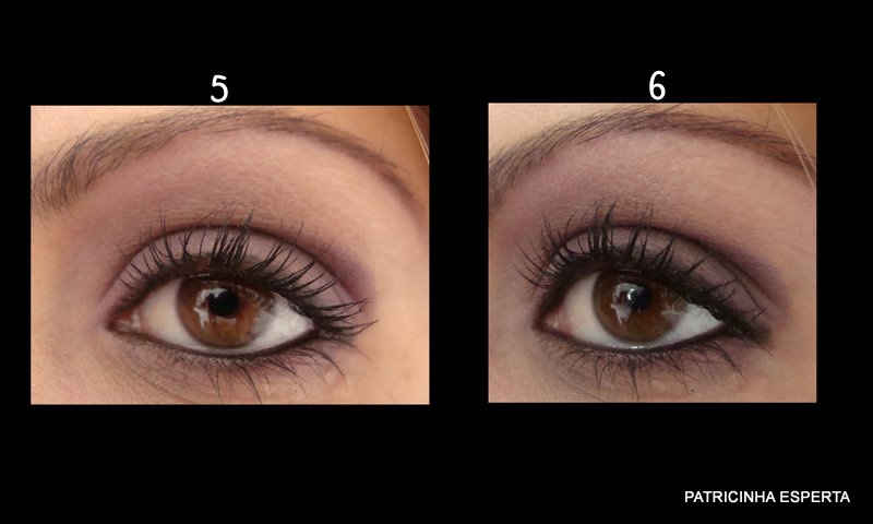 Passo lápis preto na linha d`água dos cílios inferiores ( foto 5) e duas camadas de rímel preto nos cílios superiores e inferiores ( foto 6).