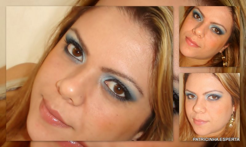 Feito isso, fui pegando, aos poucos, mais sombra cinza e esfumando por toda a pálpebra móvel e também no côncavo (puxando para cima). Em seguida apliquei a sombra azul clara rente as sobrancelhas ( foto 3). Passei a sombra azul escura da Contém 1g em toda a pálpebra móvel ( foto 4).