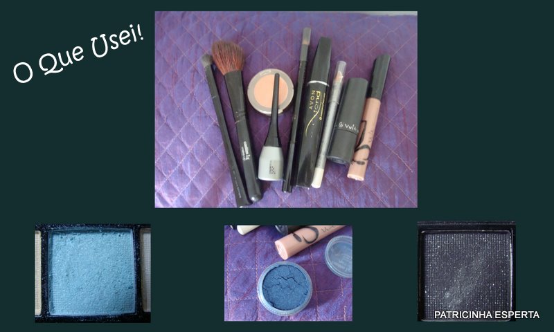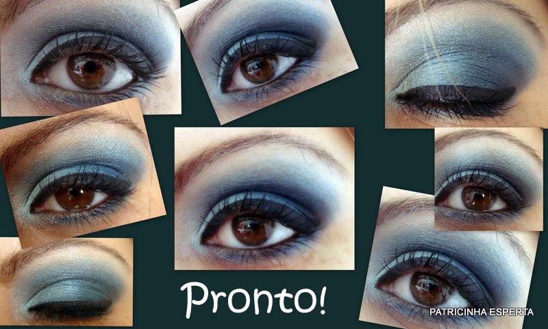 Para dar um aproveitamento melhor nessa paleta tive que usar um primer de sombras, que passei em toda a pálpebra. Comecei aplicando sem muita intensidade um lápis branco do canto interno até o centro da pálpebra e por cima apliquei a sombra azuzinha( foto 1). Peguei a sombra cinza escuro e passei do centro até o canto externo e também no côncavo ( foto 2), mas sem deixar muito intenso.