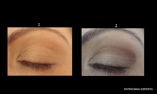 Apliquei, com o pincel de sombras da Avon, a sombra douradinha e em todo o olho, desde a pálpebra móvel até bem rente à sobrancelha ( foto 1). Em seguida marquei o côncavo e o canto externo com uma sombra dourado escuro para dar profundidade ao olhar ( foto 2).