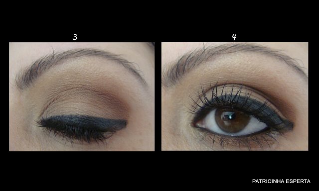 Feito isso, fiz um traço grosso com lápis preto rente aos cílios superiores e apliquei lápis preto na linha d`água dos cílios inferiores. ( foto 3). Passei o pincel sujo de sombra dourado escuro rente aos cílios inferiores e apliquei duas camadas de rímel nos cílios superiores e inferiores ( foto 4).