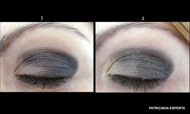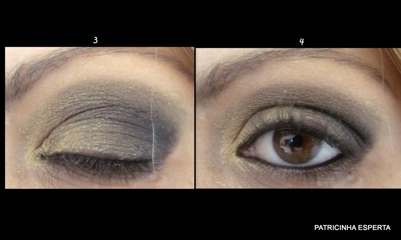 Passei a sombra dourada no canto interno (foto 2) e fui esfumando até fazer um degradê suave ( foto 3). Aproveitei o pincel sujinho de dourado e passei rente a sobrancelha.