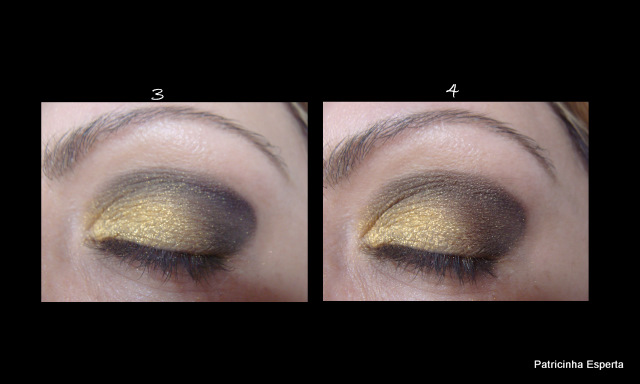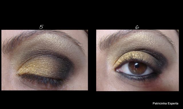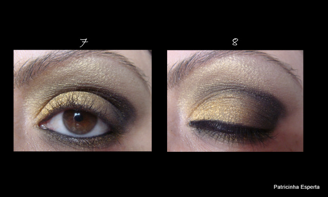 Por cima do borradinho de lápis preto, apliquei a sombra dourada com um pincel chanfrado, só pra dar um brilho ( foto 7).