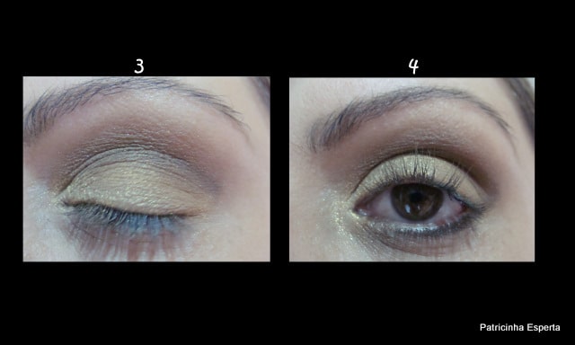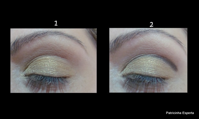 Comecei aplicando sombra dourada em toda a pálpebra móvel (foto 1). Em seguida, marquei o côncavo com sombra marrom (foto 2).
