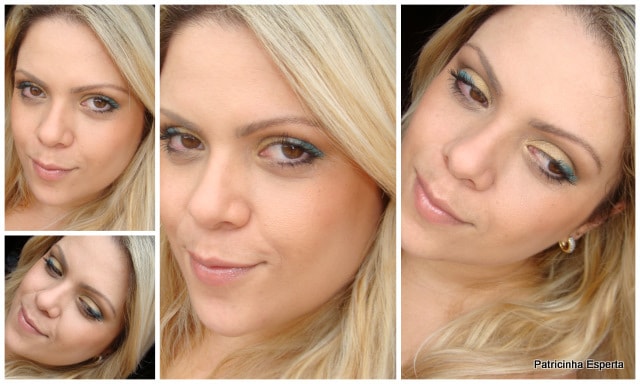 Ele é feito com sombra marrom, dourado e delineador turquesa, mas pode ser substituído por delineador de qualquer cor, e acho que fica lindo com um traçado com verde-musgo, por exemplo.