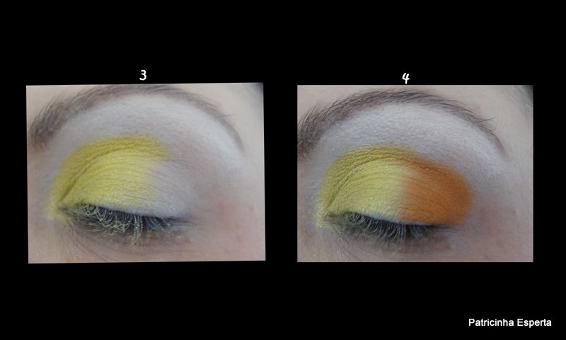 Em seguida, apliquei a sombra amarela do canto interno até o centro da pálpebra móvel e côncavo ( foto 3), e a sombra laranja do canto externo até o centro da pálpebra móvel ( foto 4).