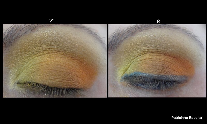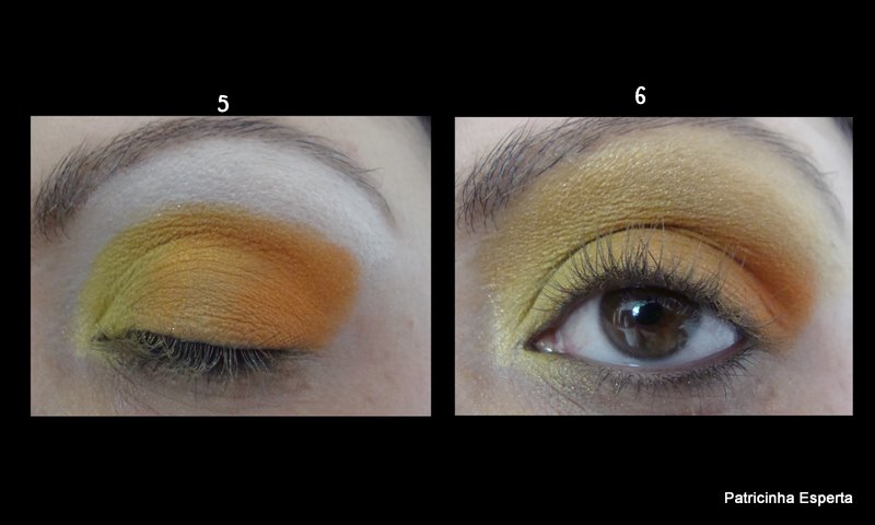 Esfumei a sombra laranja em direção ao canto interno para misturar bem as duas cores ( foto 5) e depois apliquei uma sombra amarela brilhosa acima do côncavo e rente à sobrancelha ( foto 6).
