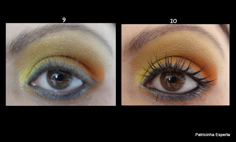 Apliquei o delineador em lápis azul na linha rente aos cílios inferiores e sombra laranja abaixo dele ( foto 9). Lápis preto na linha d`água e duas camadas de rímel dão o efeito final ( foto 10)