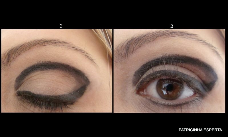 O que fiz na foto 1 foi marcar toda a pálpebra móvel. Com um traçado bem fino eu marco com um lápis preto a linha abaixo dos cílios inferiores (foto 2).