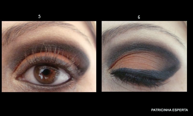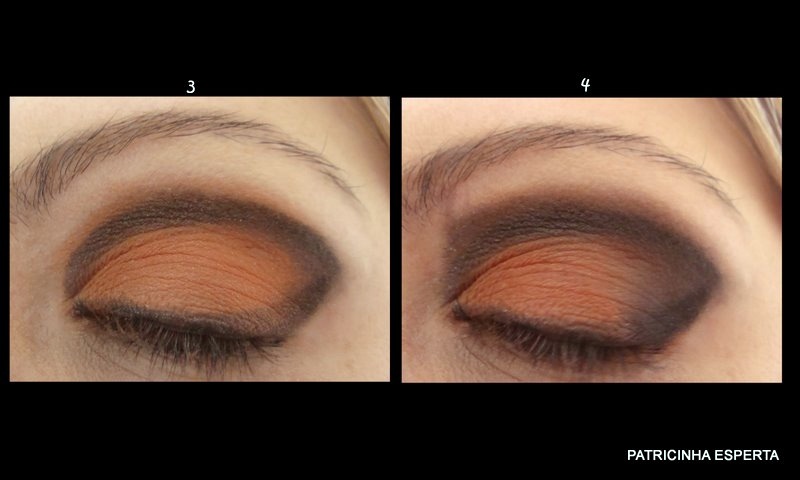 Esfumo bastante o côncavo, sobretudo no canto interno, e deposito um pouco de sombra cinza escura no canto externo (foto 4). Aproveito e passo um pouco da sombra laranja na linha abaixo dos cílios inferiores.
