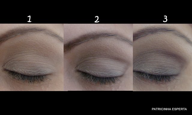 Começo espalhando a sombra bege clara em toda a pálpebra móvel ( foto 1). Ela é bem cor de pele mesmo e clareia minha pálpebra que é naturalmente escura.
