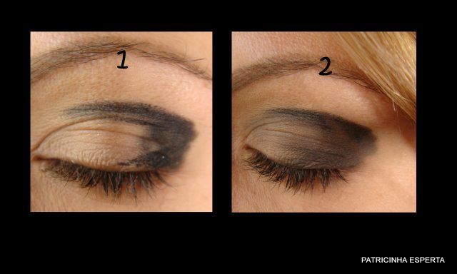 Começo marcando o canto externo do olho com lápis kajal preto, que pode ser qualquer lápis preto macio ( foto 1). Com o esfumador do próprio lápis eu esfumo o preto até ficar bem espalhadinho ( foto 2).