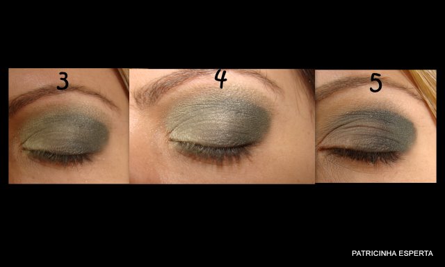 Feito isso, usei a terceira sombra do quarteto no meio da pálpebra móvel e esfumei em zig zag horizontal . Aproveitei o pincel sujinho e marquei o côncavo e o canto externo com a primeira sombra que usei, a verde musgo( foto 5).