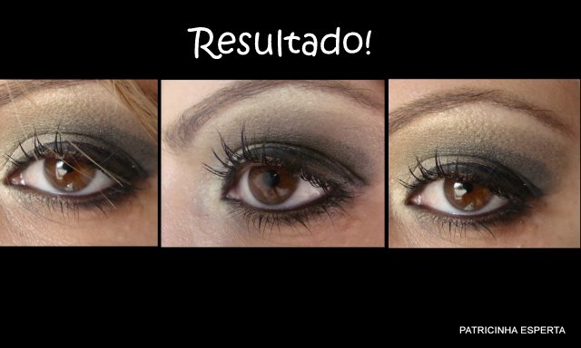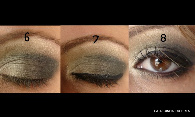 Usei a sombra verde musgo no pincel chanfrado para marcar do meio até o canto externo dos cílios inferiores. Após isso, usei duas camadas de rímel preto nos cílios superiores e apliquei lápis preto na linha d`água dos cílios inferiores ( foto 8). Está pronto!