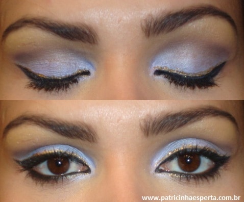 É um make comum com delineado preto, mas que com o delineador dourado em glitter, se transforma totalmente, tornando-se uma maquiagem cheia de graça e glamour.