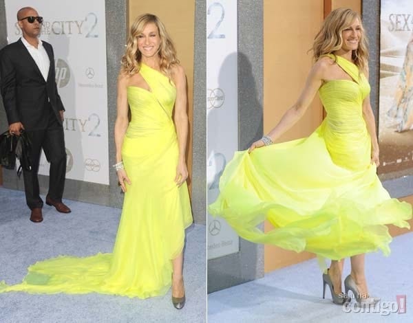Mesmo as loiras de plantão podem usar o amarelo sem medo. Um exemplo é a diva Sarah Jéssica Parker, olha como essa cor ficou lindíssima nela. Ao invés de apagar (o que a maioria das loiras pensa), o amarelo deu brilho e luz ao visual. O modelo do vestido é outro caso a parte. Um luxo!!!