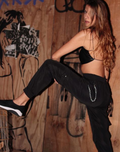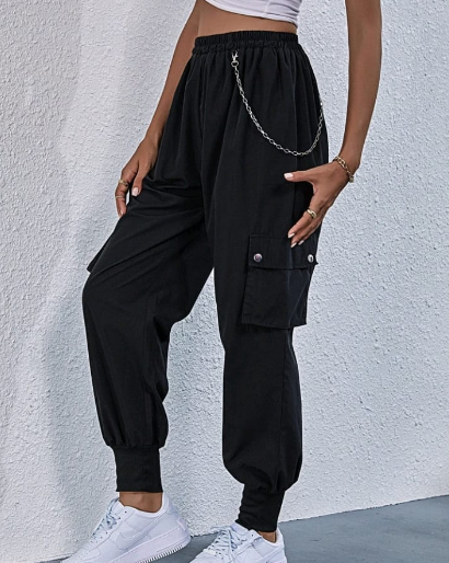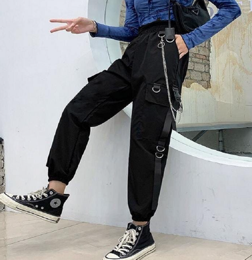 # A calça com corrente combina muito com peças cheias de bolsos e zíper