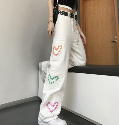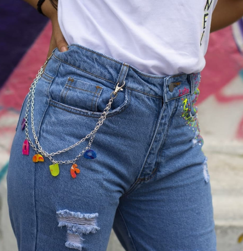 Você pode, por exemplo, adicionar correntes finas nas partes rasgadas da peça, como nos joelhos ou na altura da canela