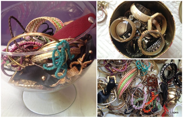 Eis o meu eterno suplício! Eu tenho MUITAS pulseiras e muitos braceletes grandes, o que dificulta super a organização, porque eles simplesmente não cabem em canto nenhum!
