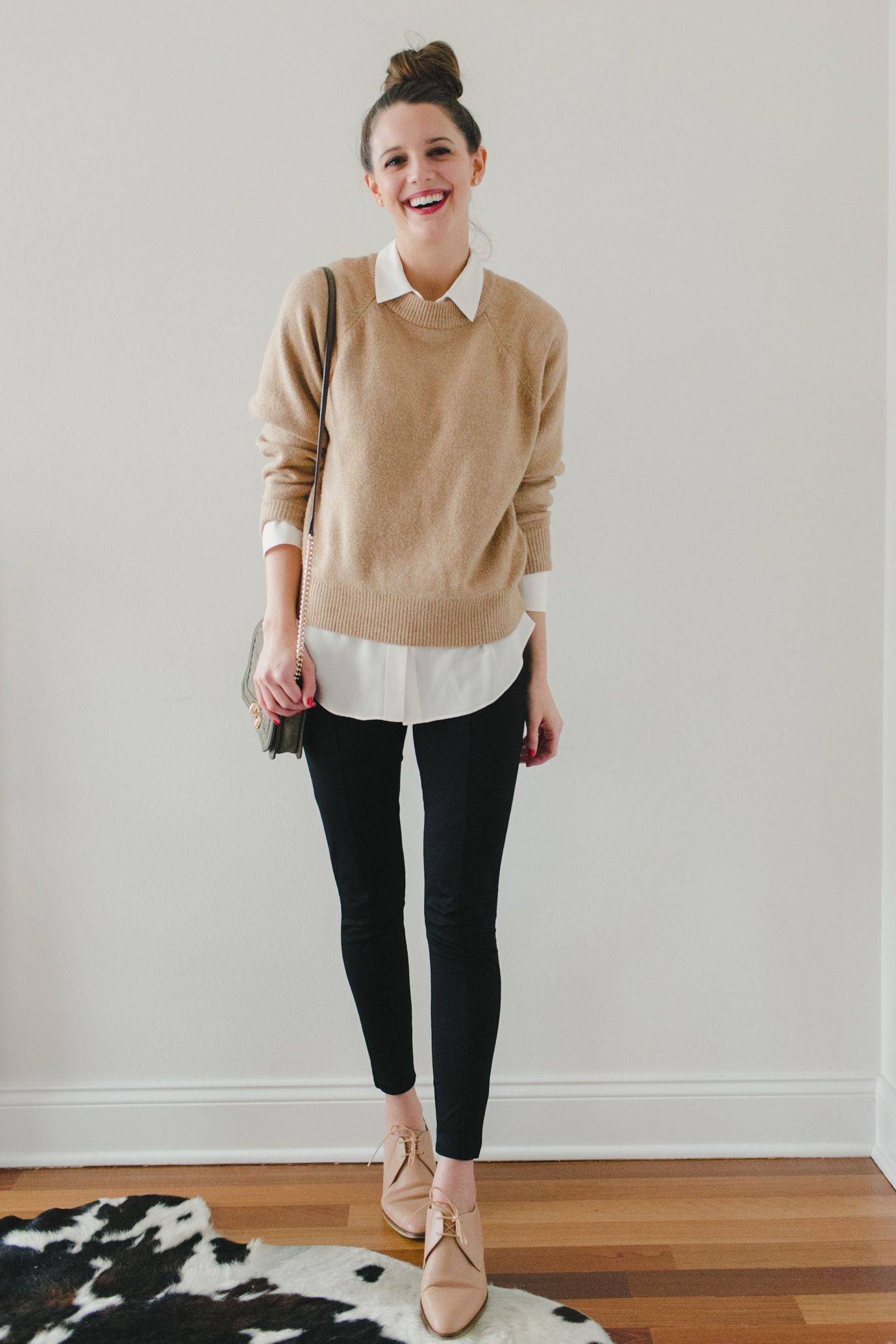 Um suéter e sapatos Oxford são uma ótima maneira de se manter aquecida e ainda ter uma aparência elegante. Essa combinação pode ser usada em várias ocasiões, incluindo trabalho, escola ou até mesmo para fazer recados.