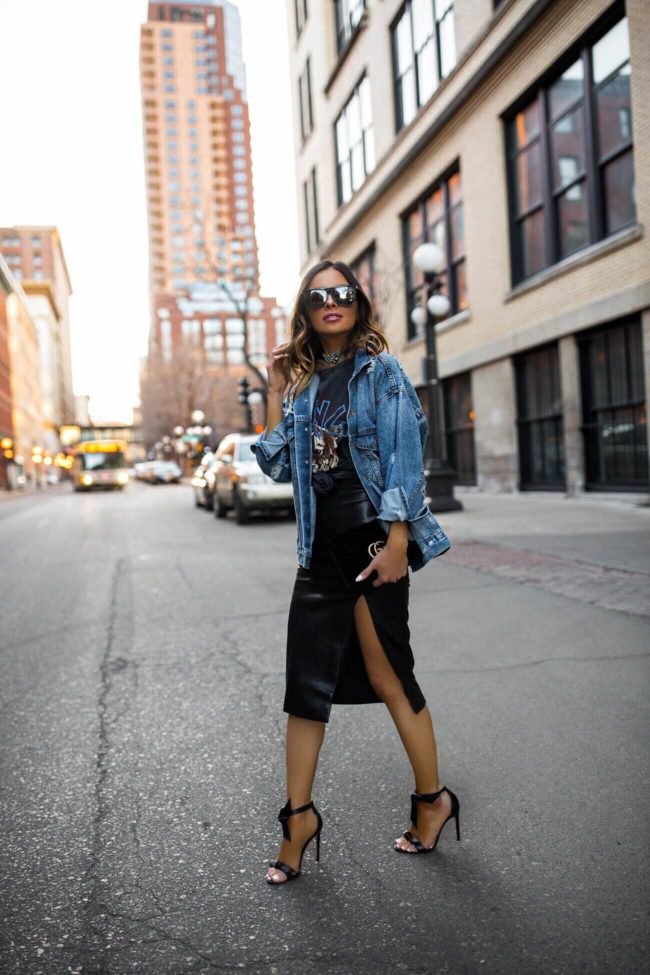 Para um look ousado, use uma saia de couro com uma camiseta e uma jaqueta de couro.