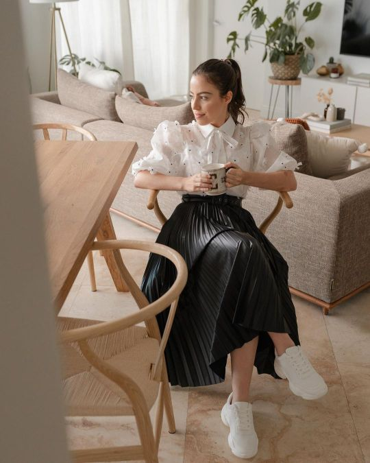 Para parecer esportiva, combine uma saia de couro plissada com uma camiseta e tênis.