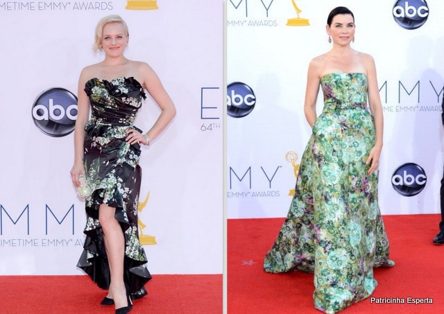 Os dois vestidos parecem ter sido feitos com a cortina da casa da vó, mas o corte do segundo é clássico e bonito, enquanto que o do primeiro é uma profusão de babados que não ornou!