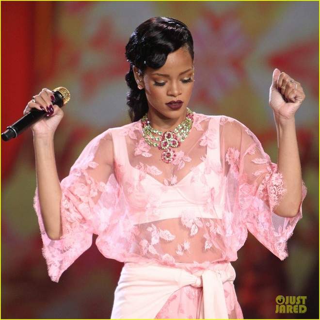 Logo que vestiu a roupa improvisada, a diva surgiu no palco e arrasou: era uma blusa rosa de renda, botas no mesmo tom e um colar vintage. Ela cantou Diamonds eFresh Off The Runway.