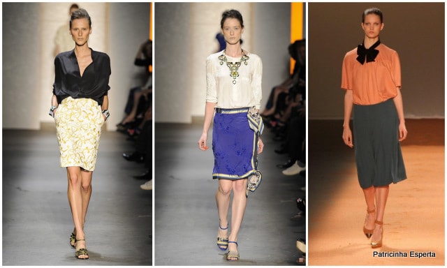 Modelagens estruturadas nas saias, que variaram bastante de tamanho ( das micro as longas) e saia lápis foram as mais vistas.