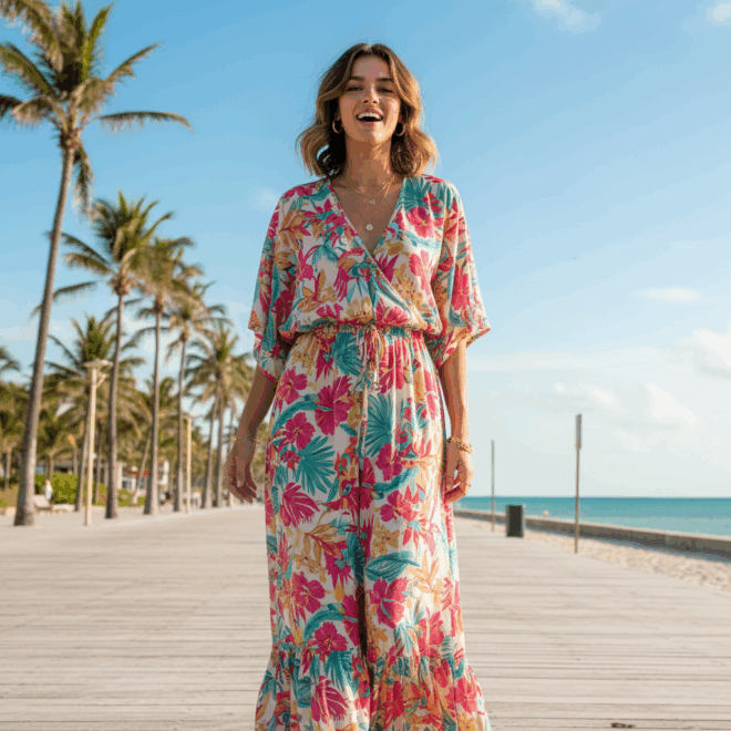 Quem disse que o calor impede a elegância? Este look prova o contrário, combinando estampas tropicais vibrantes com um caimento sofisticado. O vestido midi, com sua silhueta fluida, é perfeito para o happy hour ou um jantar à beira-mar, proporcionando um toque de glamour sem esforço. Escolha tecidos leves, como viscose ou seda sintética, para garantir o conforto.