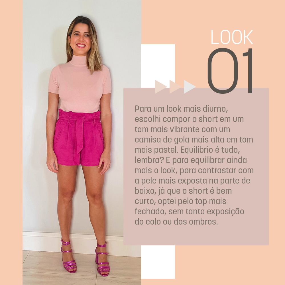 Para um look mais diurno, escolhi compor o short em um tom mais vibrante com um camisa de gola mais alta em tom mais pastel. Equilíbrio é tudo, lembra? E para equilibrar ainda mais o look, para contrastar com a pele mais exposta na parte de baixo, já que o short é bem curto, optei pelo top mais fechado, sem tanta exposição do colo ou dos ombros.