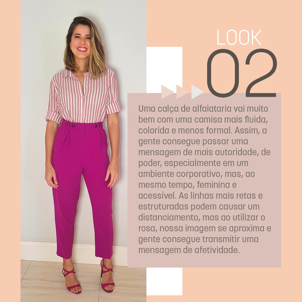 Uma calça de alfaiataria vai muito bem com uma camisa mais fluida, colorida e menos formal. Assim, a gente consegue passar uma mensagem de mais autoridade, de poder, especialmente em um ambiente corporativo, mas ao mesmo tempo feminina e acessível. As linhas mais retas e estruturadas, podem causar um distanciamento, mas ao utilizar o rosa, nossa imagem se aproxima e gente consegue transmitir uma mensagem de afetividade.