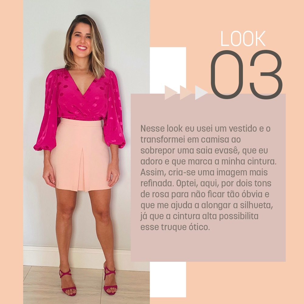 Nesse look eu usei um vestido e o transformei em camisa ao sobrepor uma saia evasê, que eu adoro e que marca a minha cintura. Assim, cria-se uma imagem mais refinada. Optei, aqui, por dois tons de rosa para não ficar tão óbvia e me ajuda a alongar a silhueta, já que a cintura alta possibilita esse truque ótico.