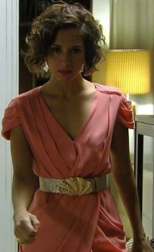 Carol também exibiu na novela um vestido coral, com decote V, transpassado, com mangas, Lindo!