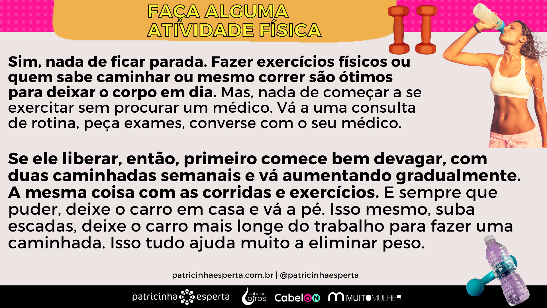 Se ele liberar, então, primeiro comece bem devagar, com duas caminhadas semanais e vá aumentando gradualmente. A mesma coisa com as corridas e exercícios. E sempre que puder, deixe o carro em casa e vá a pé. Isso mesmo, suba escadas, deixe o carro mais longe do trabalho para fazer uma caminhada. Isso tudo ajuda muito a eliminar peso.