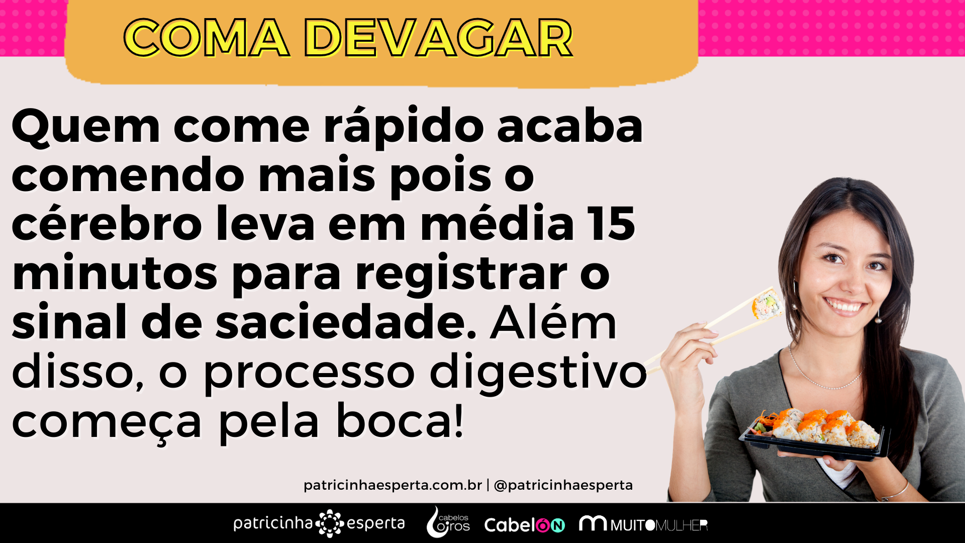 Quem come rápido acaba comendo mais pois o cérebro leva em média 15 minutos para registrar o sinal de saciedade. Além disso, o processo digestivo começa pela boca!