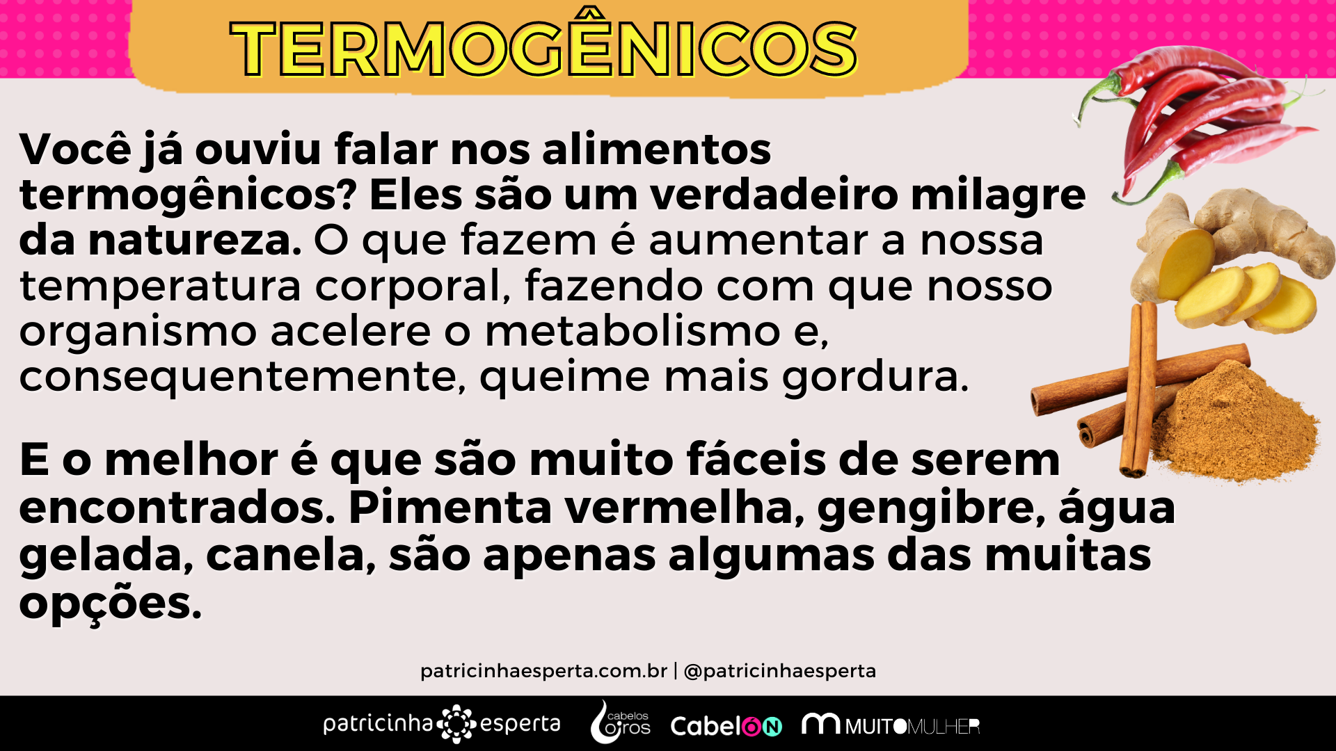 E o melhor é que são muito fáceis de serem encontrados. Pimenta vermelha, gengibre, água gelada, canela, são apenas algumas das muitas opções.