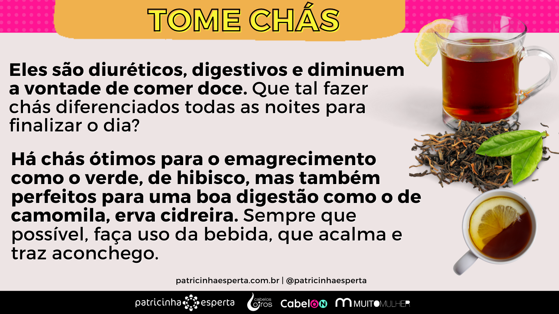 Há chás ótimos para o emagrecimento como o verde, de hibisco, mas também perfeitos para uma boa digestão como o de camomila, erva cidreira. Sempre que possível, faça uso da bebida, que acalma e traz aconchego.