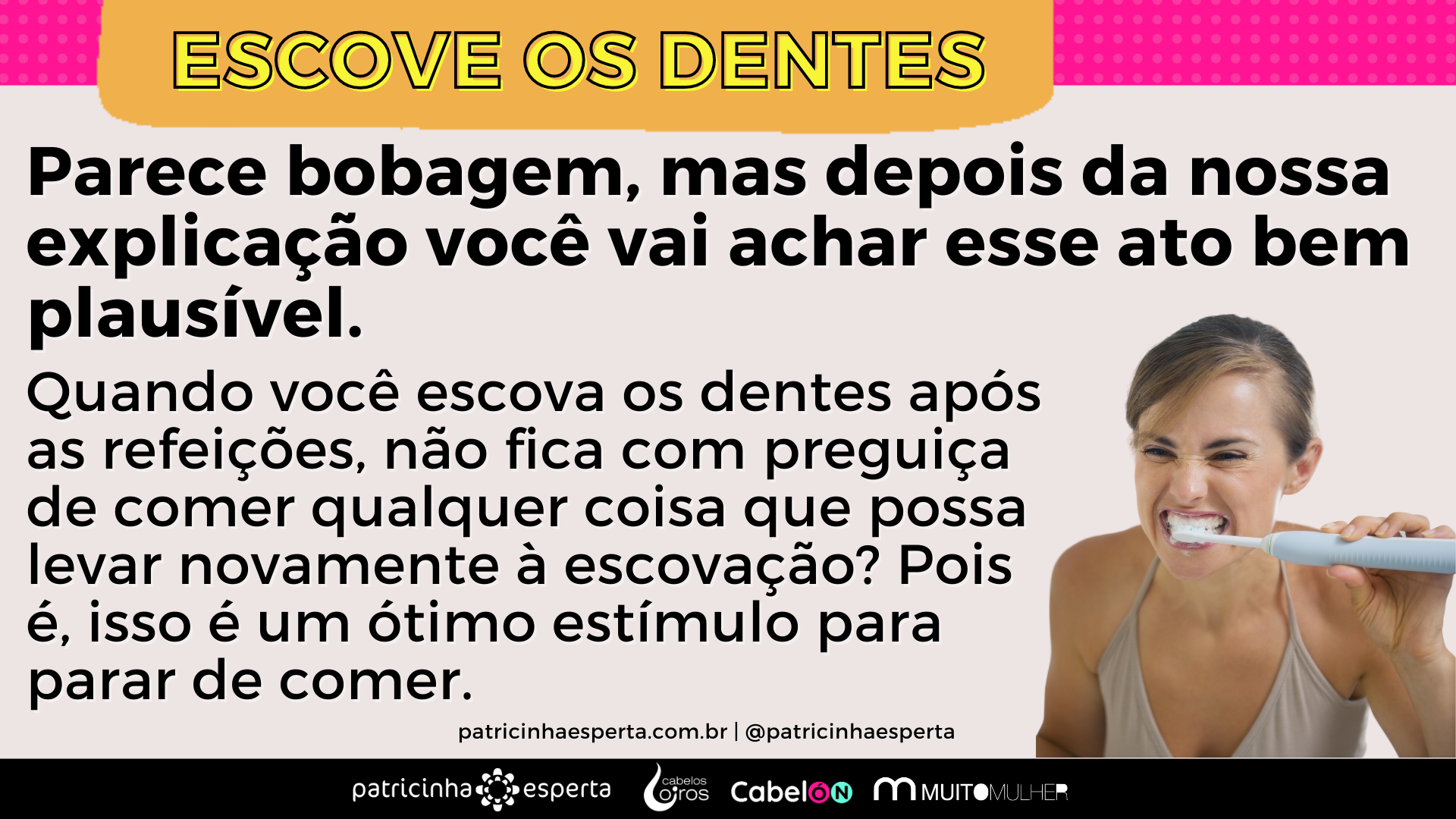 Quando você escova os dentes após as refeições, não fica com preguiça de comer qualquer coisa que possa levar novamente à escovação? Pois é, isso é um ótimo estímulo para parar de comer.