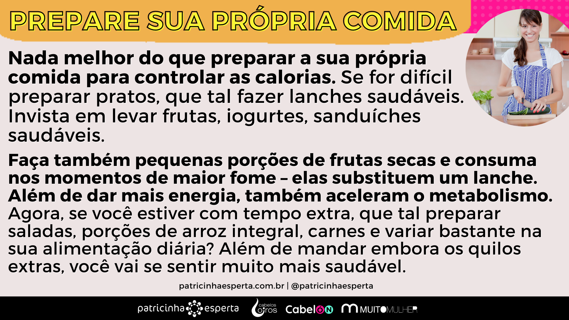 Faça também pequenas porções de frutas secas e consuma nos momentos de maior fome – elas substituem um lanche. Além de dar mais energia, também aceleram o metabolismo. Agora, se você estiver com tempo extra, que tal preparar saladas, porções de arroz integral, carnes e variar bastante na sua alimentação diária? Além de mandar embora os quilos extras, você vai se sentir muito mais saudável.