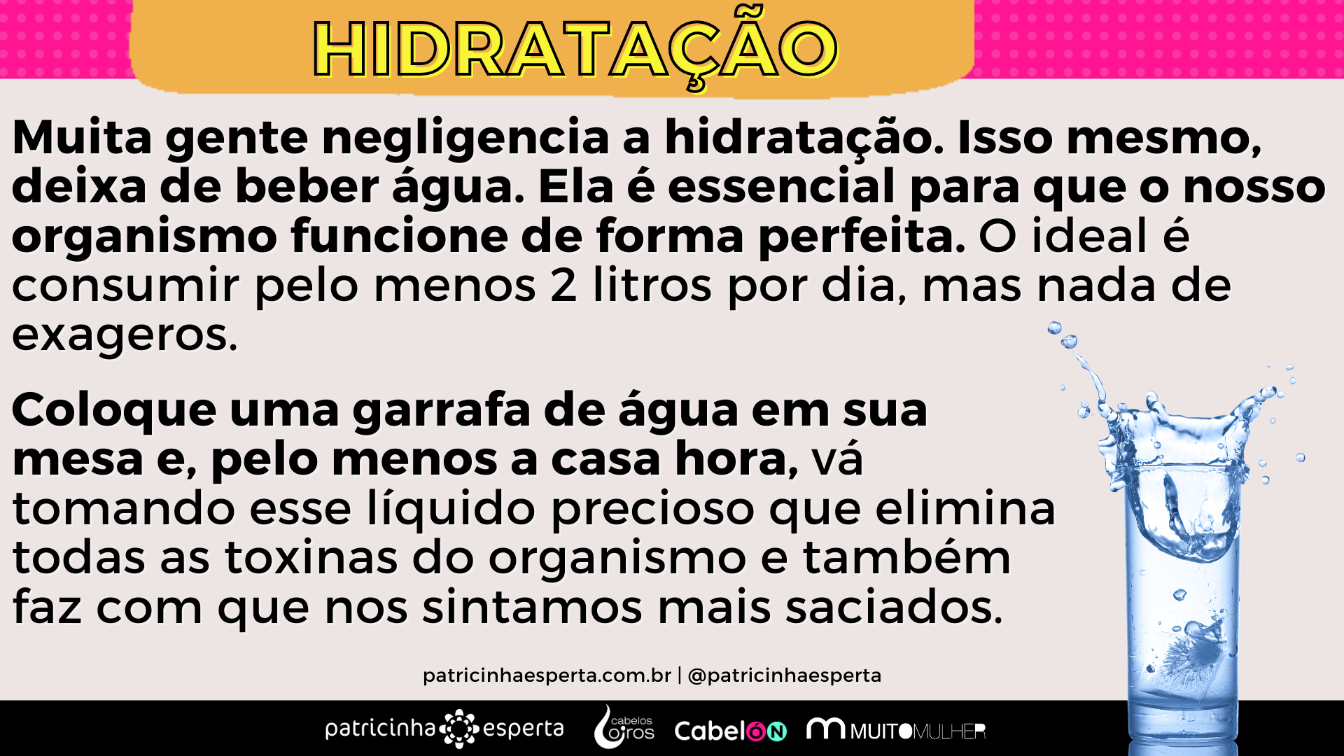 Muita gente negligencia a hidratação. Isso mesmo, deixa de beber água. Ela é essencial para que o nosso organismo funcione de forma perfeita. O ideal é consumir pelo menos 2 litros por dia, mas nada de exageros.