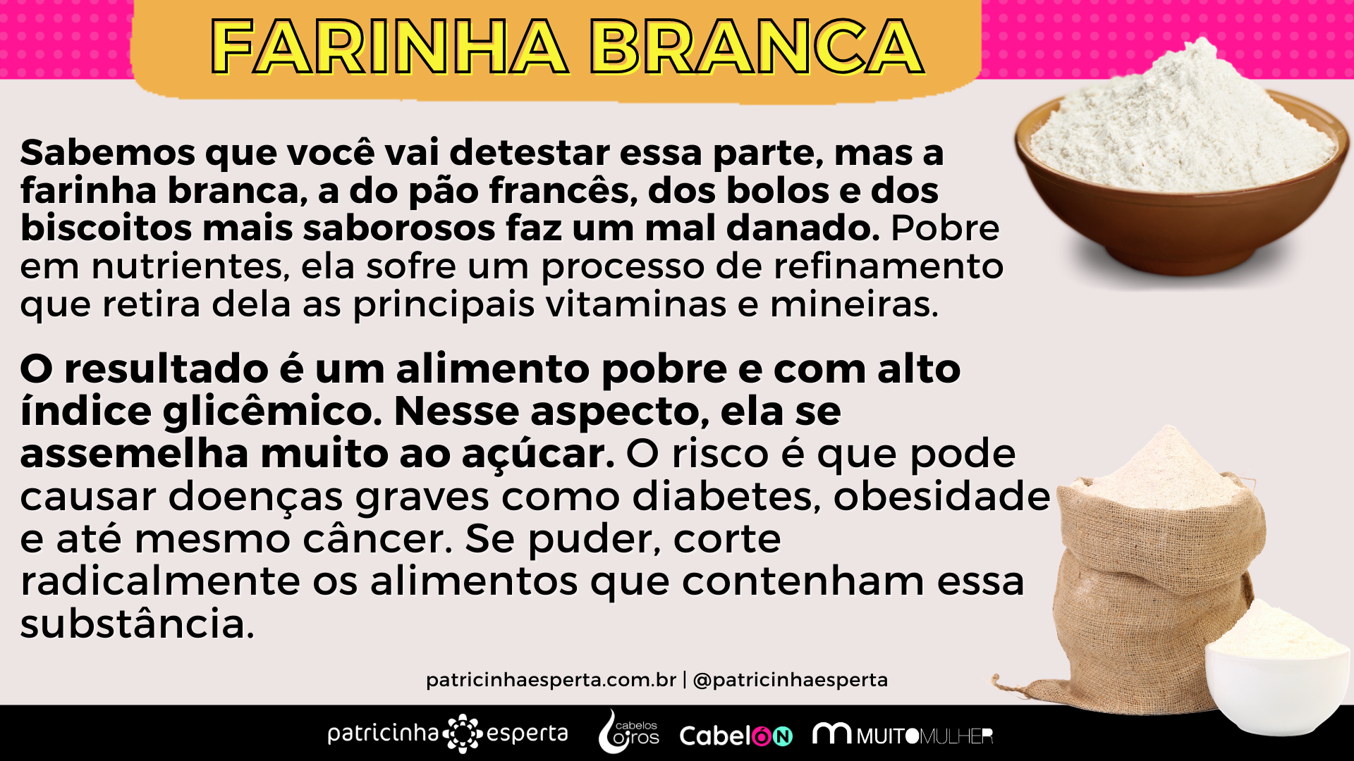 Sabemos que você vai detestar essa parte, mas a farinha branca, a do pão francês, dos bolos e dos biscoitos mais saborosos faz um mal danado. Pobre em nutrientes, ela sofre um processo de refinamento que retira dela as principais vitaminas e mineiras.