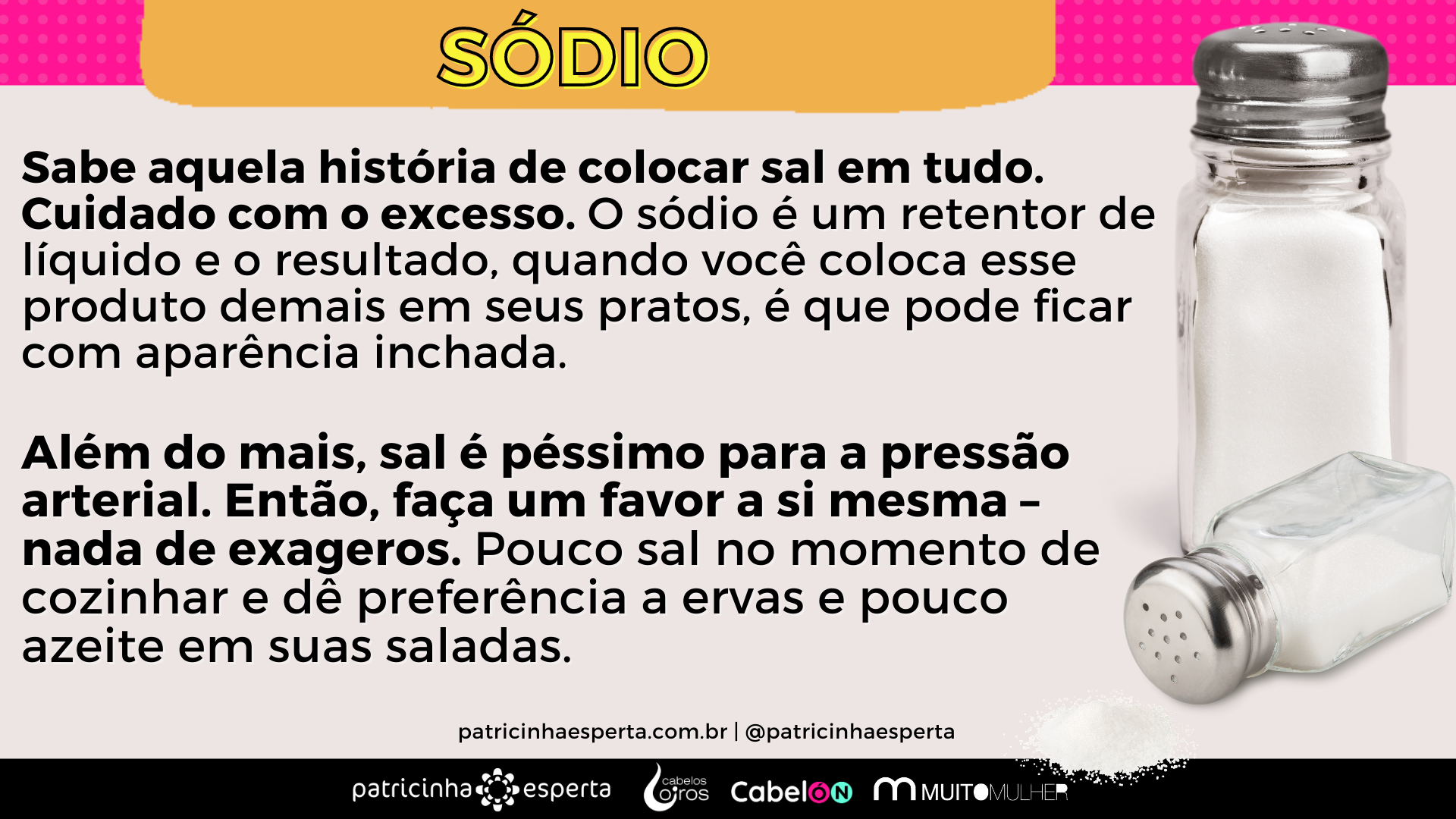 Além do mais, sal é péssimo para a pressão arterial. Então, faça um favor a si mesma – nada de exageros. Pouco sal no momento de cozinhar e dê preferência a ervas e pouco azeite em suas saladas.