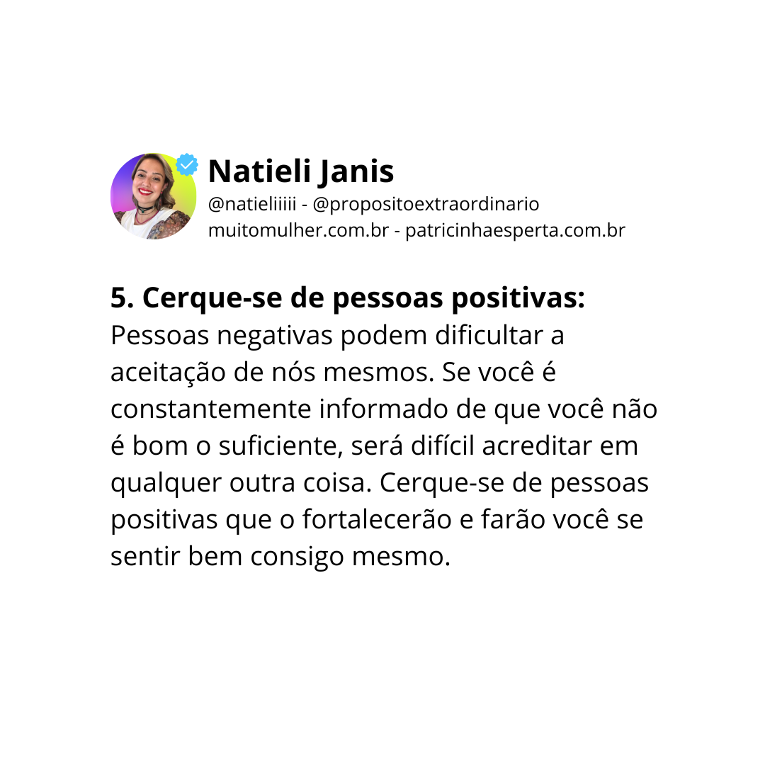 Pessoas negativas podem dificultar a aceitação de nós mesmos. Se você é constantemente informado de que você não é bom o suficiente, será difícil acreditar em qualquer outra coisa. Cerque-se de pessoas positivas que o fortalecerão e farão você se sentir bem consigo mesmo.