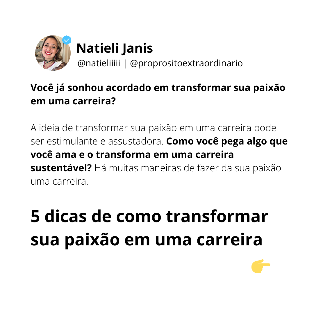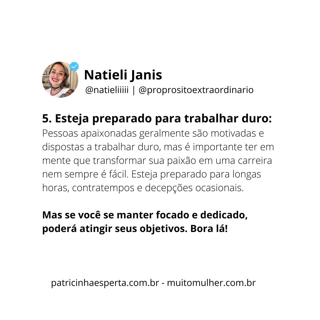Pessoas apaixonadas geralmente são motivadas e dispostas a trabalhar duro, mas é importante ter em mente que transformar sua paixão em uma carreira nem sempre é fácil. Esteja preparado para longas horas, contratempos e decepções ocasionais. Mas se você se manter focado e dedicado, poderá atingir seus objetivos. Bora lá!