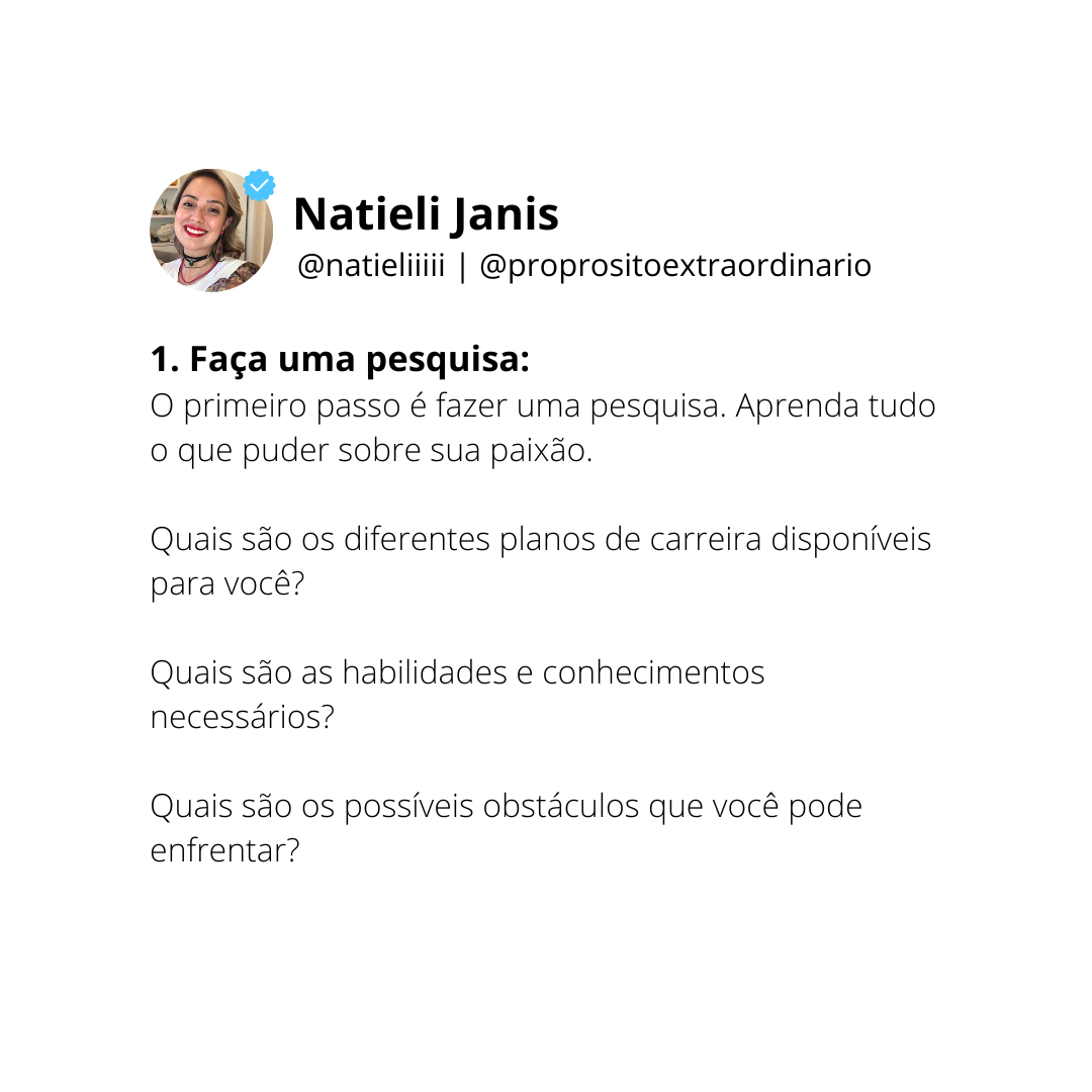 O primeiro passo é fazer uma pesquisa. Aprenda tudo o que puder sobre sua paixão. Quais são os diferentes planos de carreira disponíveis para você? Quais são as habilidades e conhecimentos necessários? Quais são os possíveis obstáculos que você pode enfrentar?
