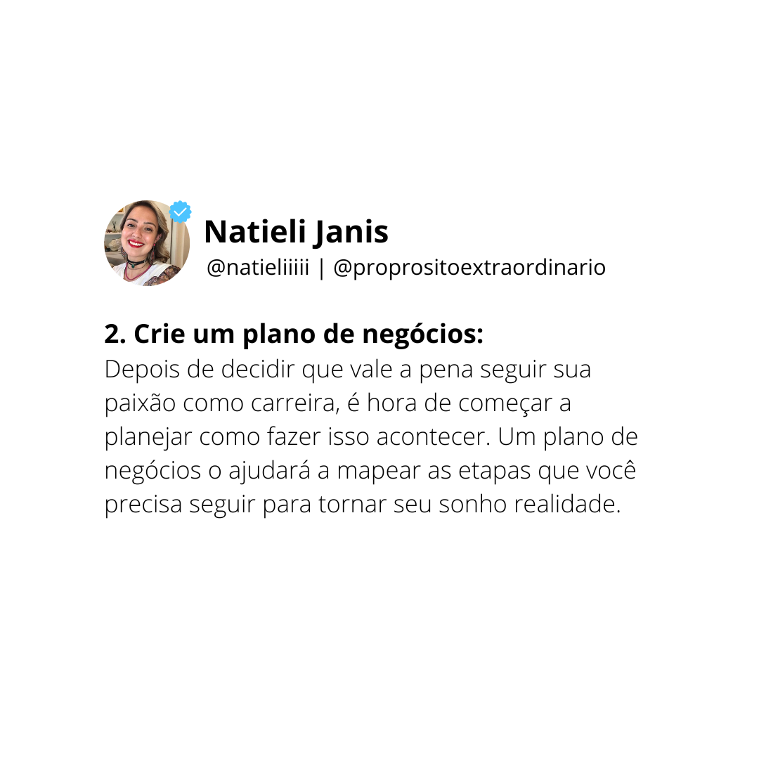 Depois de decidir que vale a pena seguir sua paixão como carreira, é hora de começar a planejar como fazer isso acontecer. Um plano de negócios o ajudará a mapear as etapas que você precisa seguir para tornar seu sonho realidade.
