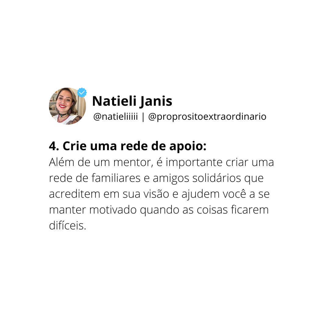 Além de um mentor, é importante criar uma rede de familiares e amigos solidários que acreditem em sua visão e ajudem você a se manter motivado quando as coisas ficarem difíceis.