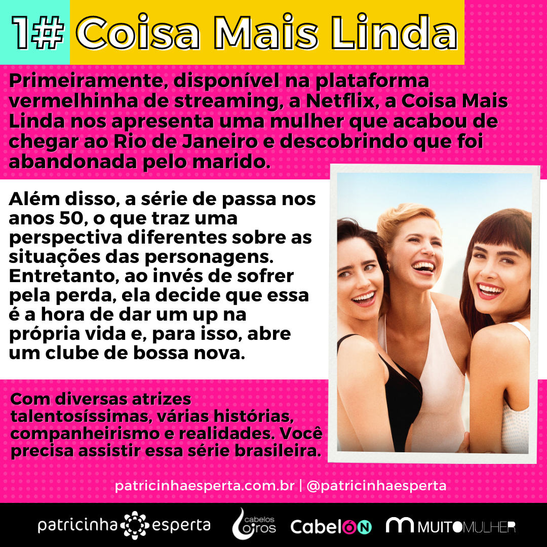 Primeiramente, disponível na plataforma vermelhinha de streaming, a Netflix, a Coisa Mais Linda nos apresenta uma mulher que acabou de chegar ao Rio de Janeiro e descobrindo que foi abandonada pelo marido.