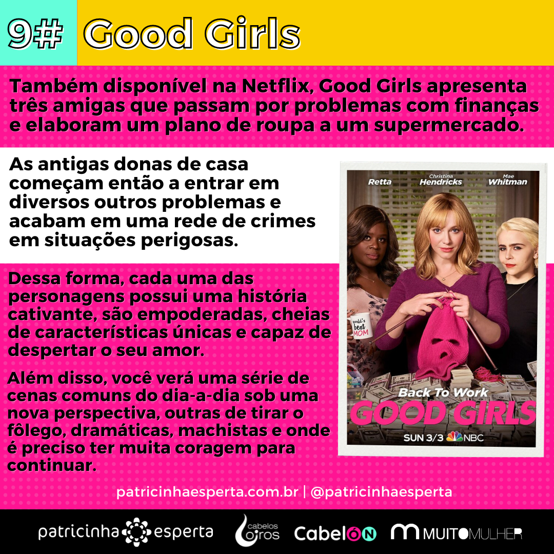 Também disponível na Netflix, Good Girls apresenta três amigas que passam por problemas com finanças e elaboram um plano de roupa a um supermercado.
